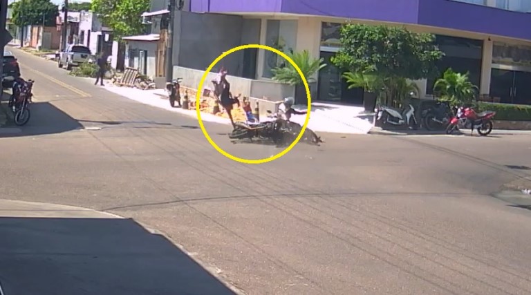 Um acidente de trânsito entre duas motos acabou com pessoas arremessadas. O acidente aconteceu em um cruzamento no município de Manacapuru (a 68 quilômetros a oeste de Manaus) e foi registrado por uma câmera de segurança.
